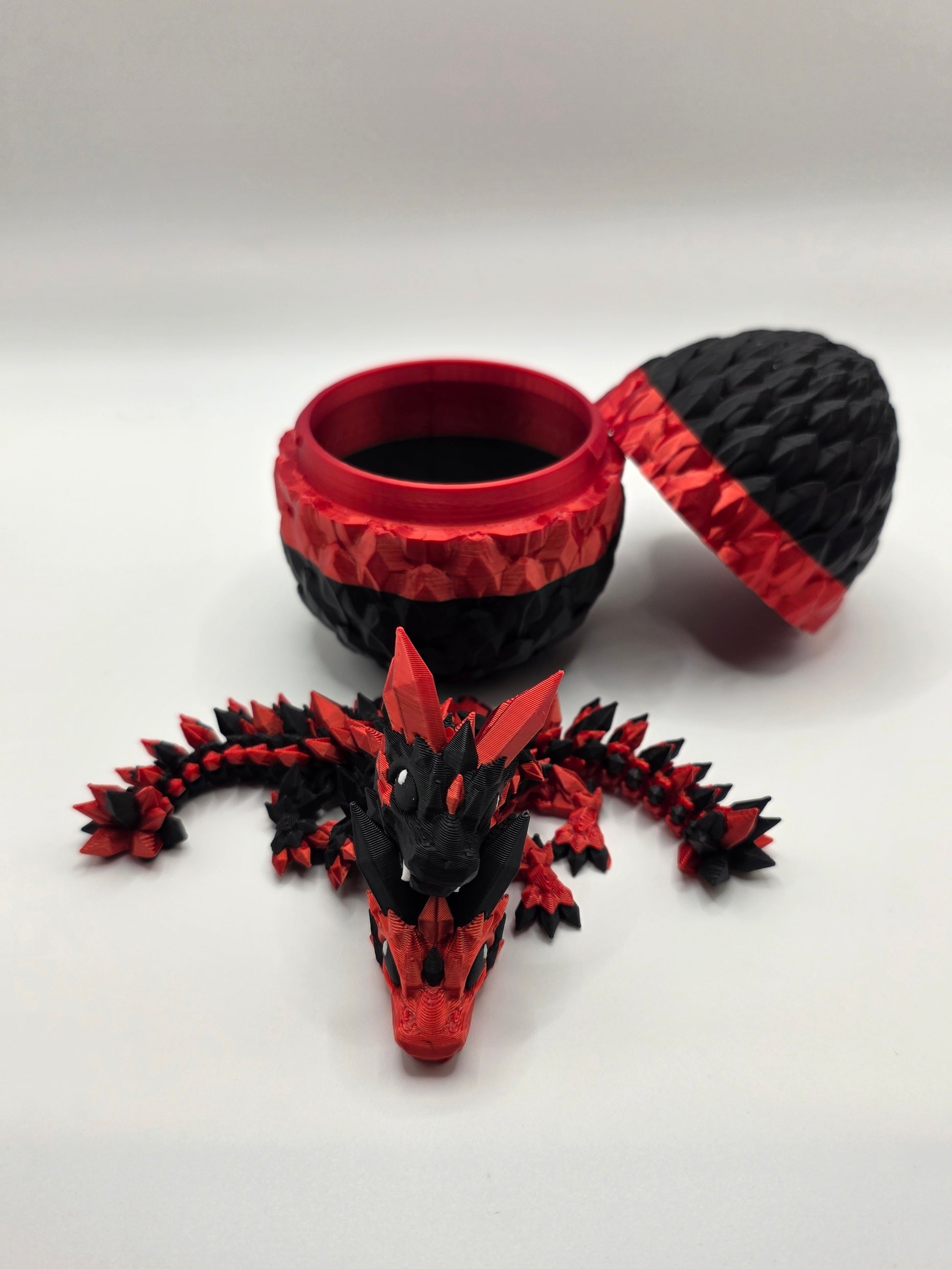 Each piece is precision-crafted in the USA using high-quality, safe and durable filament's. Blending deep colors or a Matte Black and Fiery Red for a bold, eye-catching finish. The dragon egg twists and opens to reveal the pair of articulated twin hatchlings inside, making this a perfect display piece, collectable, or gift for fantasy lover.